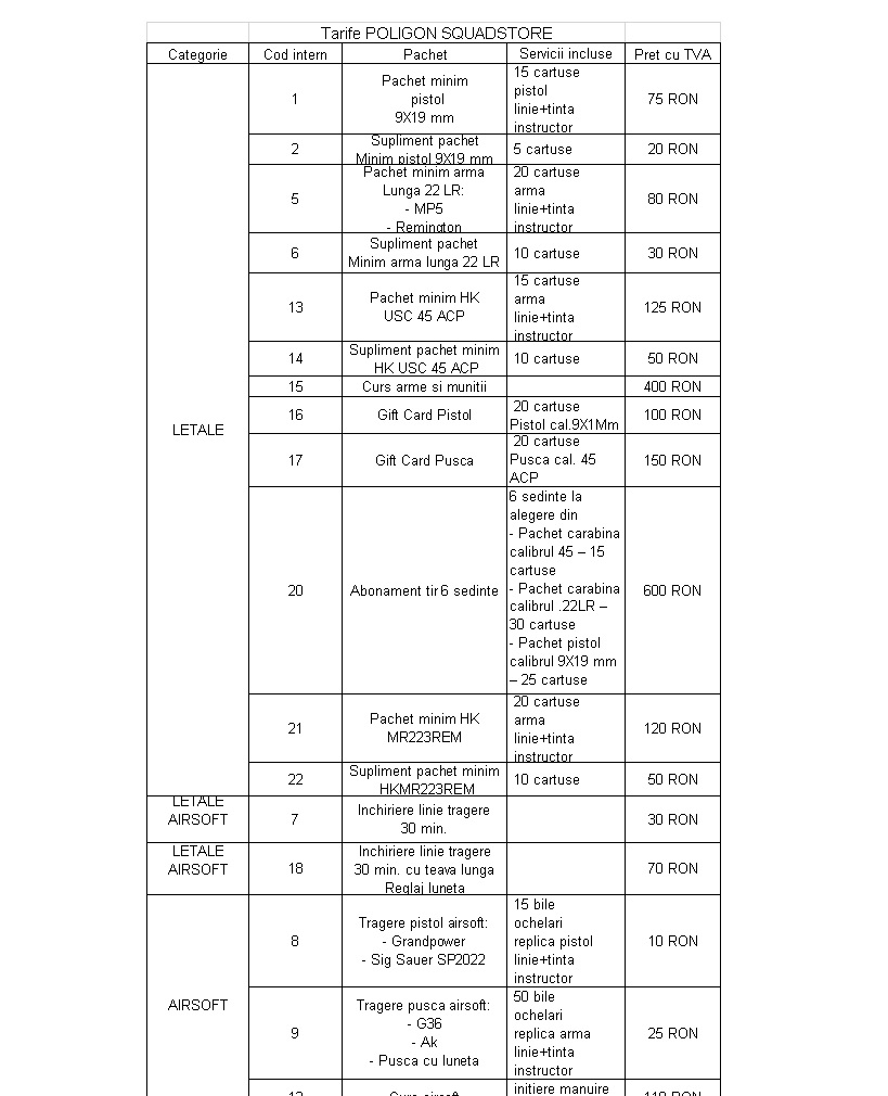 Tarife poligon de tir Squad Store Sporting