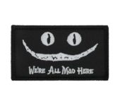 Emblema Smile and Wait – fundal negru si model alb. Dimensiuni: 70X55 mm.